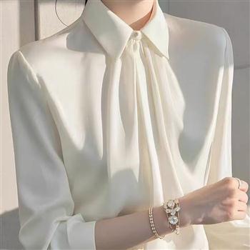 YF6427-图片色甜美白色优雅气质复古设计长袖褶折翻领宽松显瘦雪纺上衣