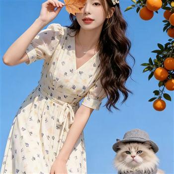 YF7280--图片色时尚夏季度假休闲碎花V领绑绳显瘦复古气质开叉新款裙子