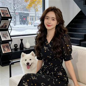 YF7279--图片色法式碎花短袖V领绑绳束腰复古蓝优雅夏季雪纺连衣裙