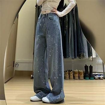 YF7281-图片色韩系烫钻满天星设计系扣高腰直筒阔腿复古蓝新款牛仔裤