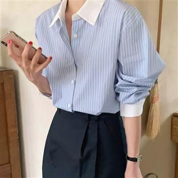 YF7282-(2色入内)甜美时尚新款撞色长袖翻领条纹显瘦大码chic气质衬衫上衣