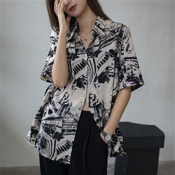 YF7283-图片色港式时尚涂鸦印花POLO领短袖宽松显瘦大码休闲百搭雪纺衫