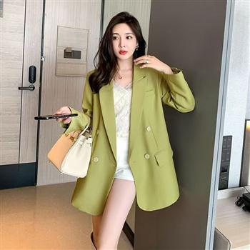 YF6512-图片色简单百搭双排扣深V设计加大码慵懒风薄何绿别致西装外套