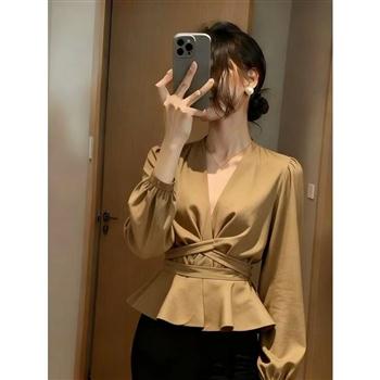 YF6513-图片色法式复古绑带系腰泡泡袖V领荷叶边独特气质短款上衣新款