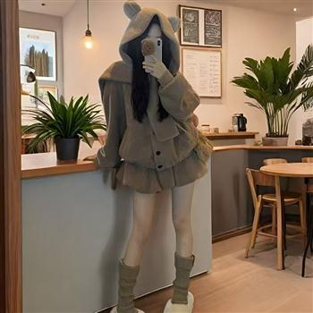 YF6515-图片色韩版小可爱熊熊设计围脖系带大码上衣搭松紧腰花苞短裙两件套