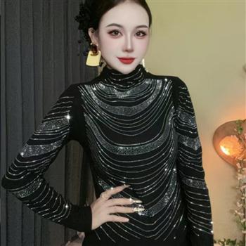 YF6359-(3色入内)秋冬名媛气质不规则烫钻设计长袖高领德绒保暖新款打底衫
