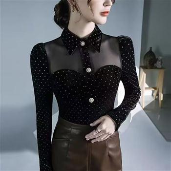 YF6364-图片色甜美时尚精品波点网纱拼接透视设计长袖POLO领衬衫