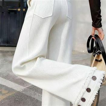 YF6939-图片色韩版高腰坑条纹流苏铆钉设计松紧腰显瘦坠地感直筒休闲裤