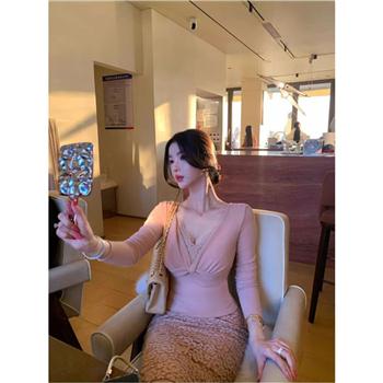YF6942-图片色2026新款长袖V领蕾丝绸拼接扭纹束胸弹力收腹显瘦假两件上衣