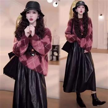 YF6951-(2色入内)秋冬复古格子撞色软糯舒适设计宽松大码显瘦慵懒风针织毛衣