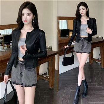 YF6211-图片色机车美少女短款长袖拉链收腰短款辣妹冬装仿皮PU皮衣上衣