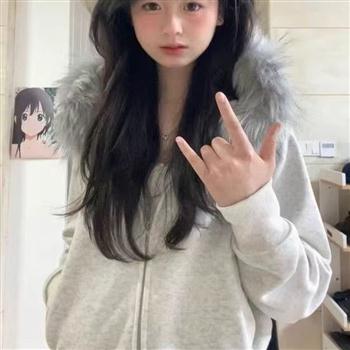 YF6214-图片色港味秋冬毛毛围边连帽长袖拉链短款字母刺绣设计休闲卫衣