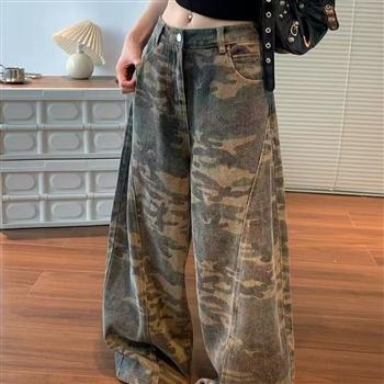 YF6215-图片色弯刀拼接设计慵懒风系扣高腰阔腿迷彩小众潮爆牛仔裤