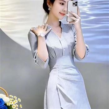 YF7458-图片色温柔风立领系扣条纹显瘦收腰不规则褶折别致感连衣裙