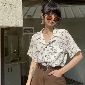 YF7460-图片色港式夏日新款时尚个性手指漫画印花宽松短袖衬衣