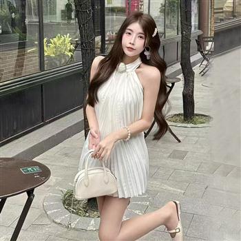 YF7461-图片色夏季重工玫瑰花围脖露肩无袖字百褶名媛气质中长款上衣