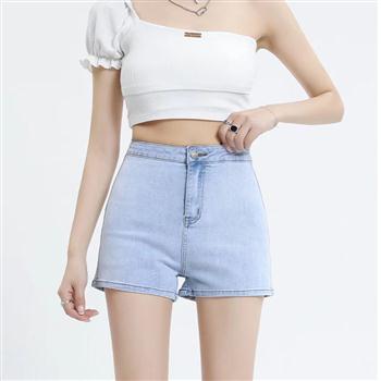YF7463-图片色韩版薄款系扣高腰弹力包臀显瘦复古蓝辣妹直筒牛仔短裤
