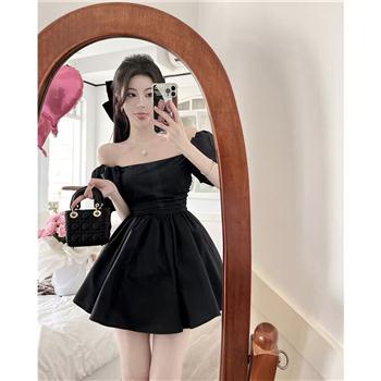 YF7464-图片色纯欲风一字肩泡泡袖收腰法式夏天蓬蓬褶折A字连衣裙