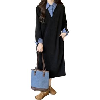 YF6282-(3色入内)慵懒风假两件拼接宽松显瘦直筒POLO领长袖小众秋冬长裙