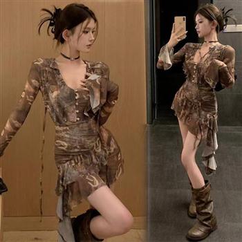 YF6285-图片色复古扎染不规则裁剪设计荷叶边小众长袖套头修身雪纺连衣裙