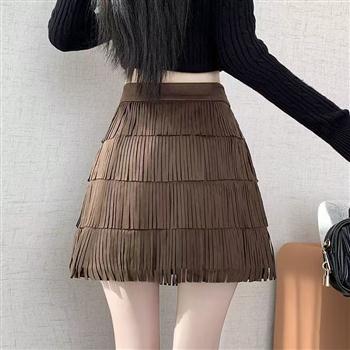 YF6280-(2色入内)辣妹新款流苏设计高腰显瘦A字反磨沙皮蓬蓬短裙
