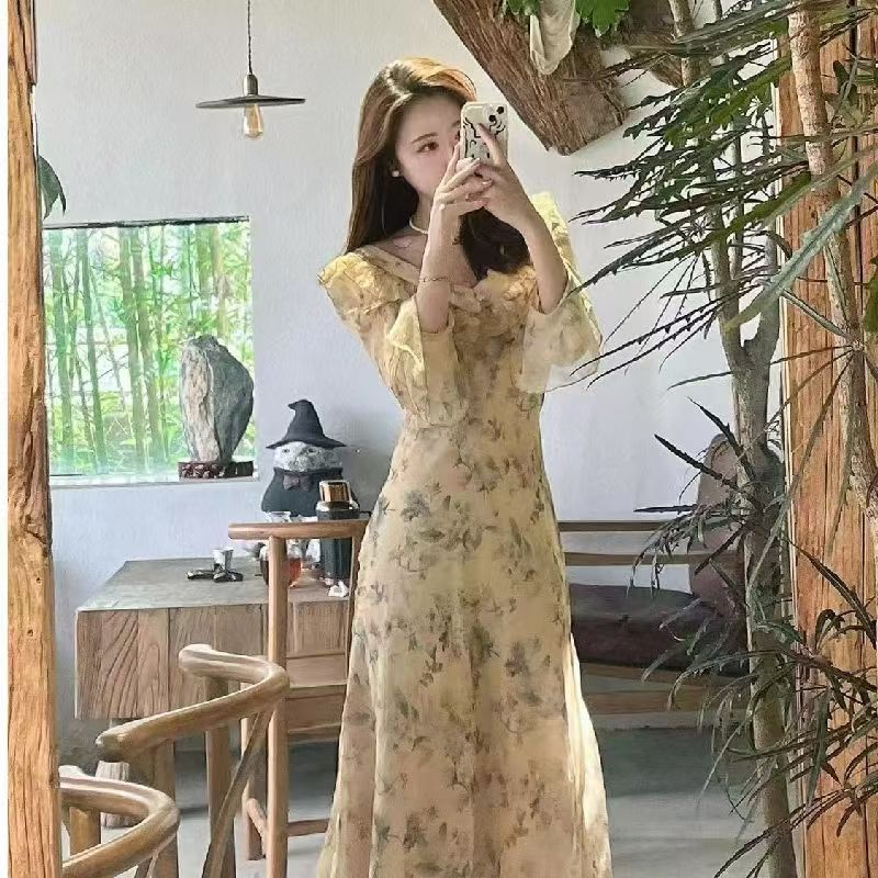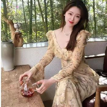 YF6429-图片色韩版优雅时尚碎花新款套头长袖收腰坠地感梨型雪纺连衣裙