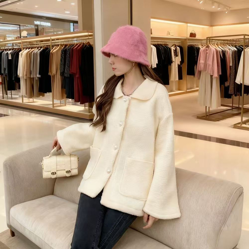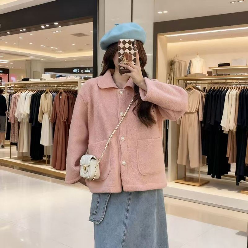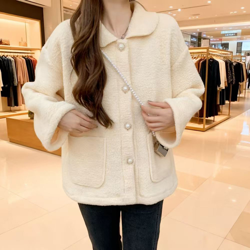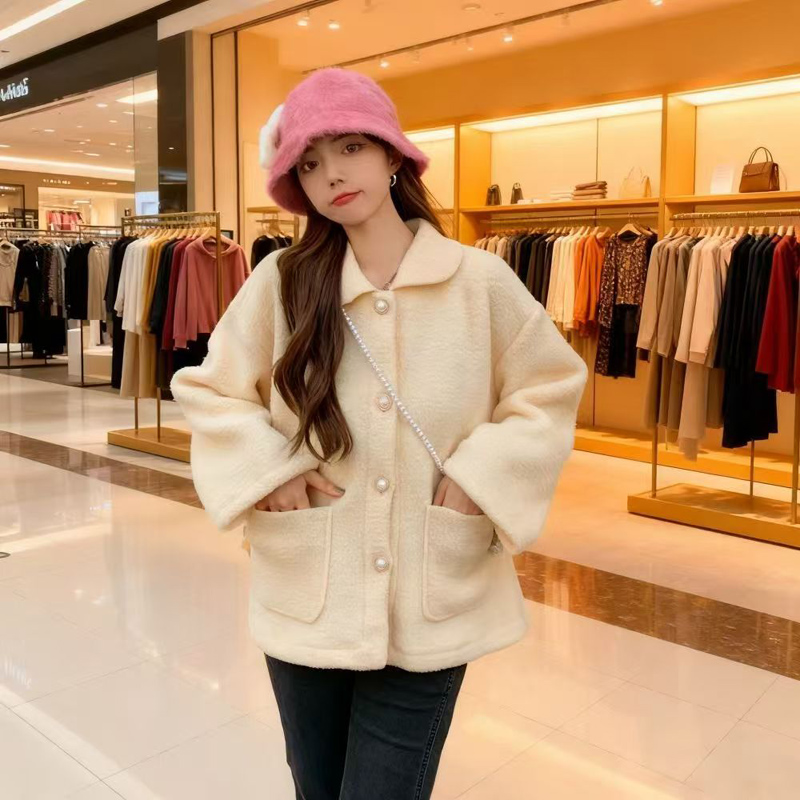 YF6432-(2色入内)冬装保暖羊羔绒加厚加绒长袖娃娃领排扣有口袋设计大码外套