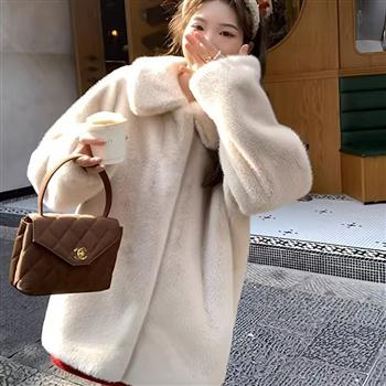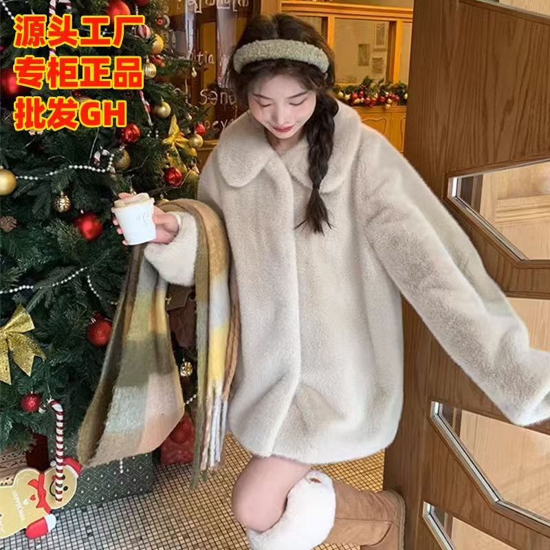 YF6638-图片色冬季加加绒加厚娃娃领系扣宽松大码水貂皮草高级感外套