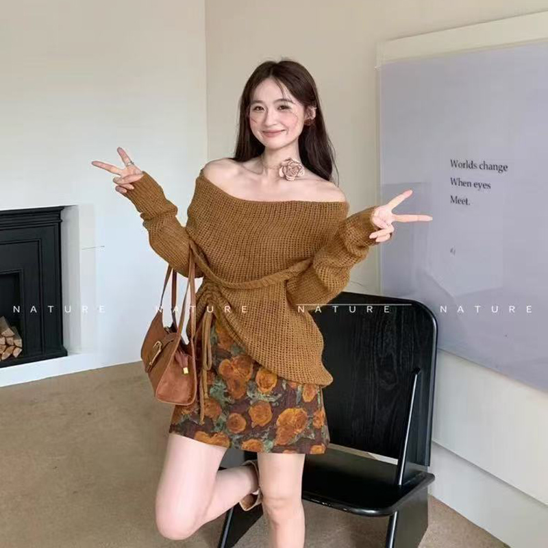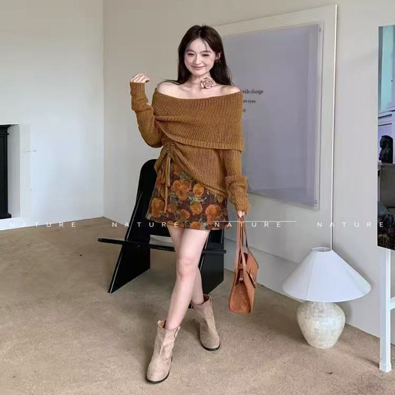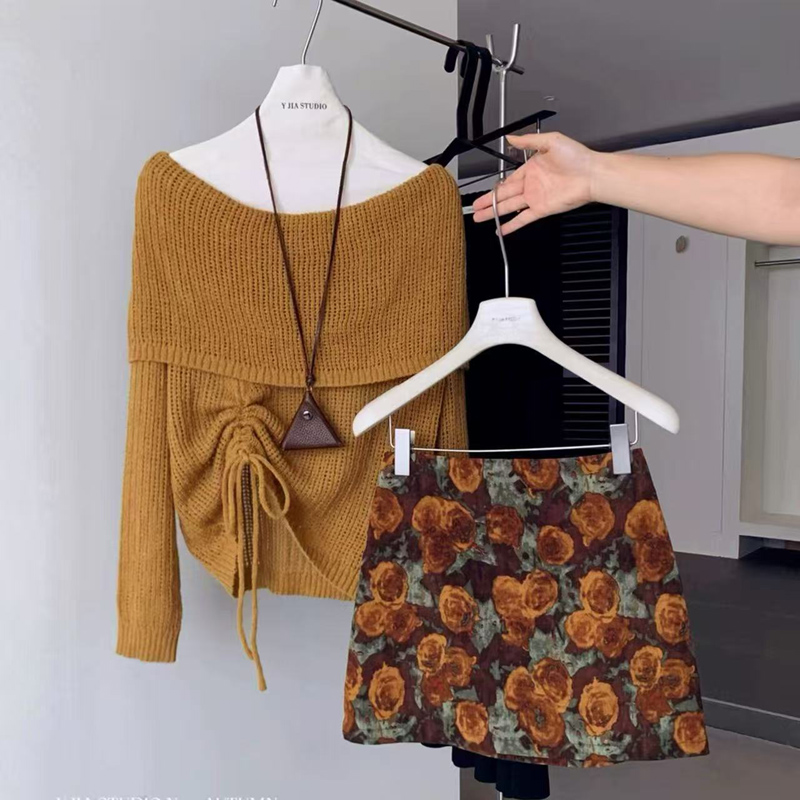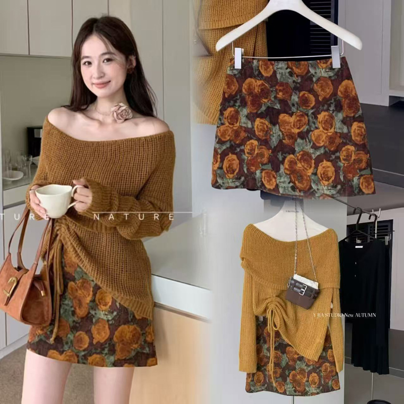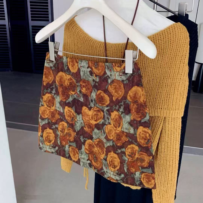 YF6668-图片法式水彩油画玫瑰花洋气设计收腹高腰A字辣妹新款防走光短裙