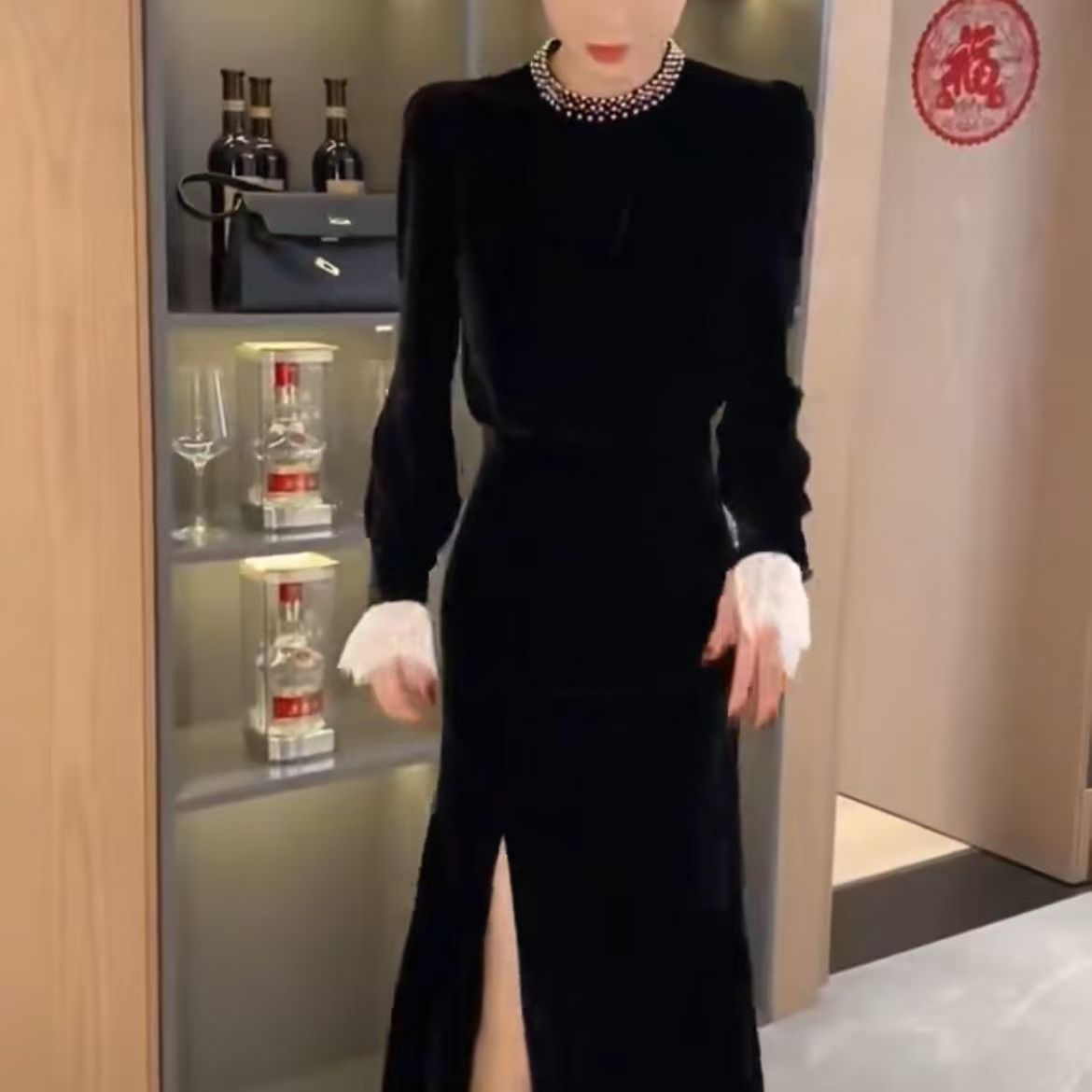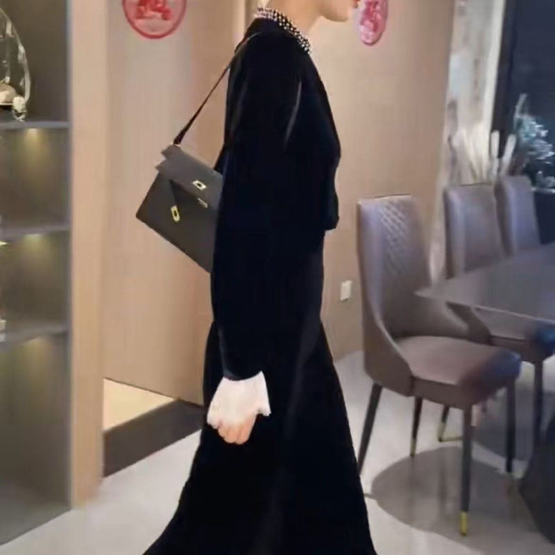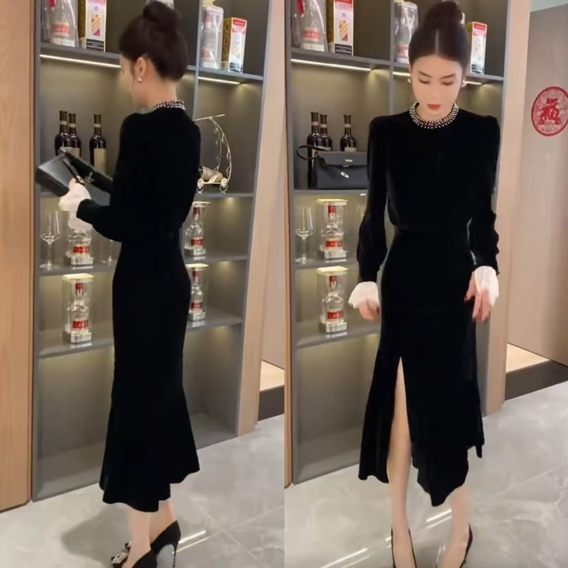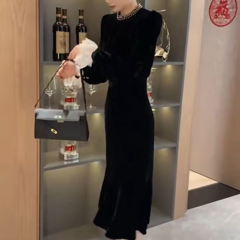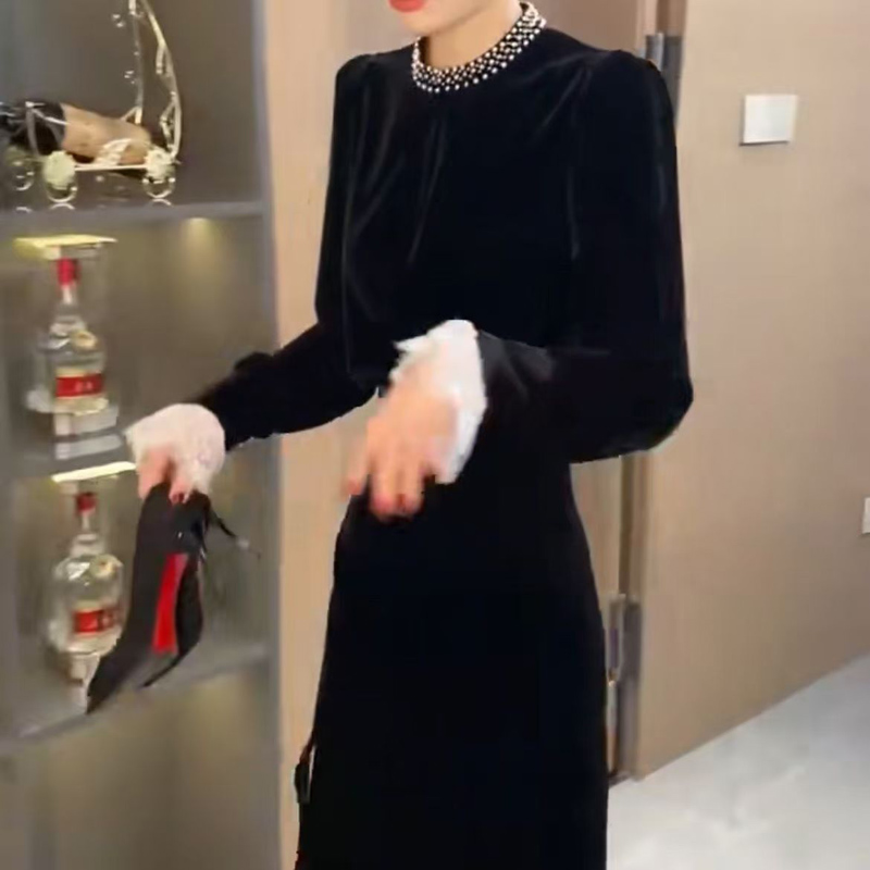YF6675-图片色名媛气质钉珠围脖收腰开叉金丝绒过膝中长款秋冬赫本风连衣裙
