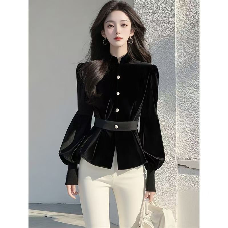YF6677-图片色金丝绸秋冬新款泡泡袖立领排扣修腰显瘦开叉设计黑色上衣