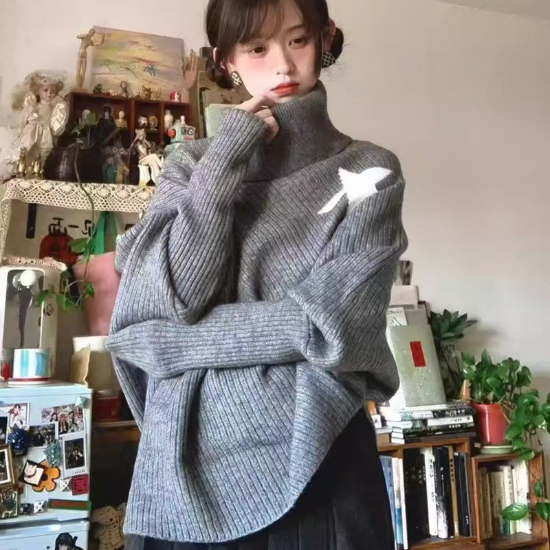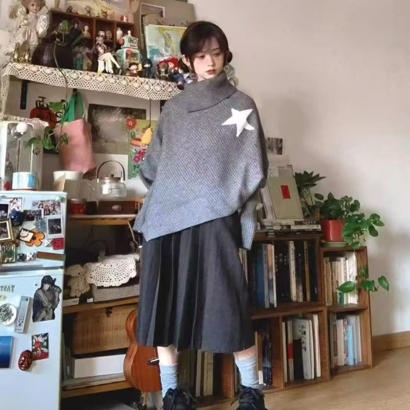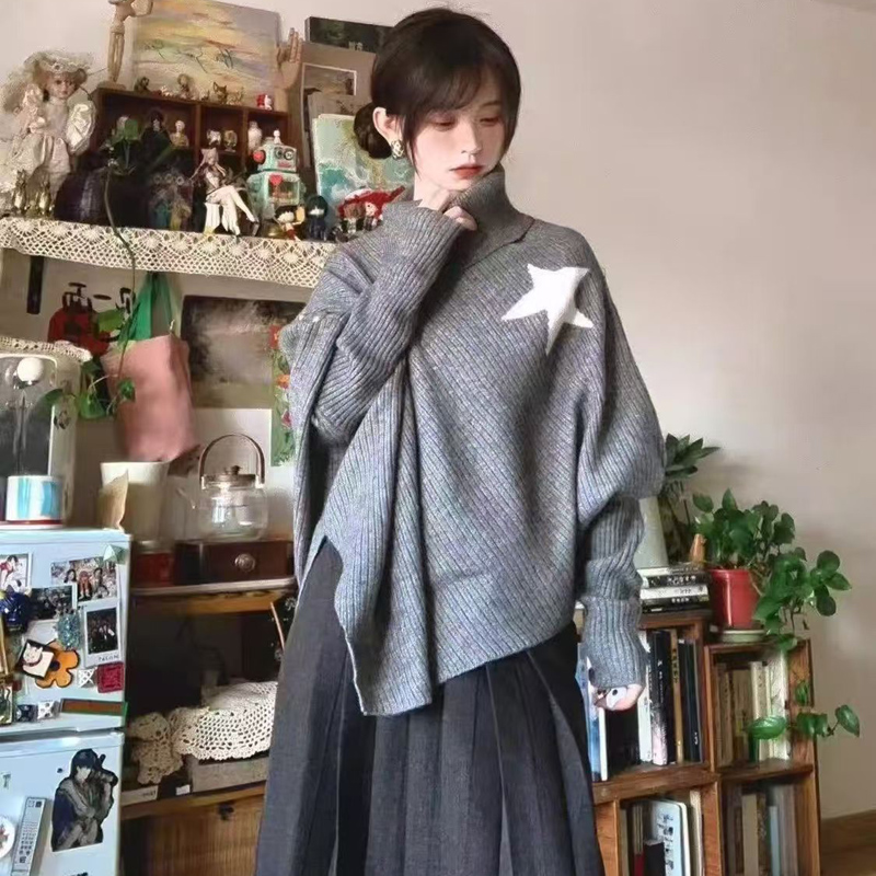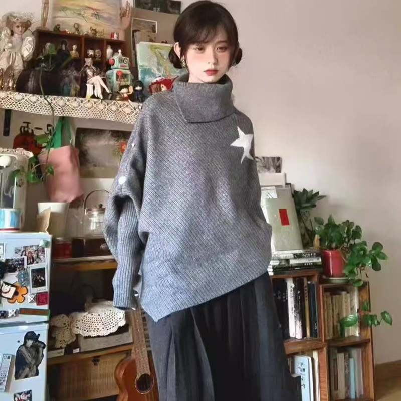 YF6967-图片色时尚冬装不规则星星长袖高领宽松开叉显瘦蝙蝠袖针织毛衣