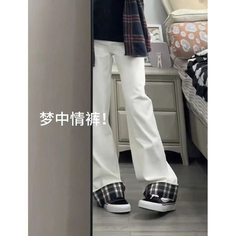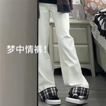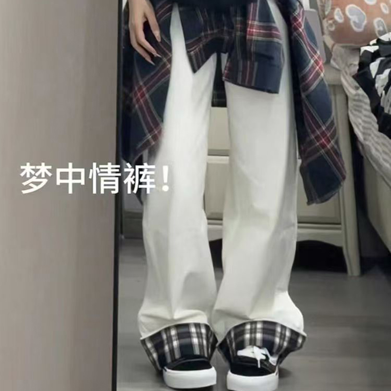 YF7078-图片色韩版时尚复古格子卷边系扣高腰直筒白色高雅气质牛仔裤