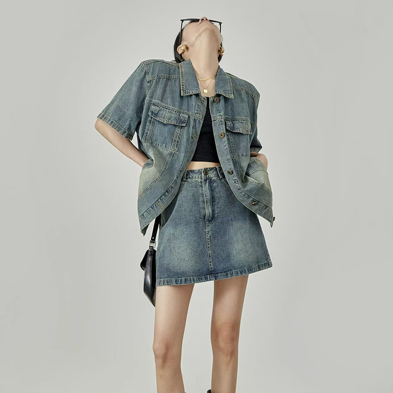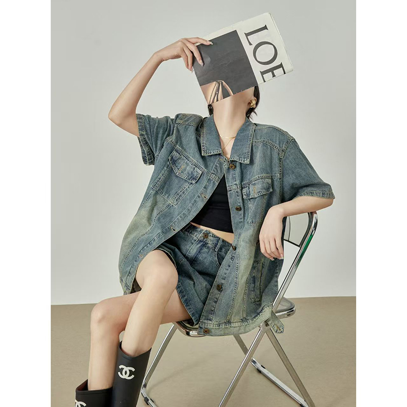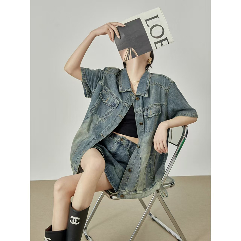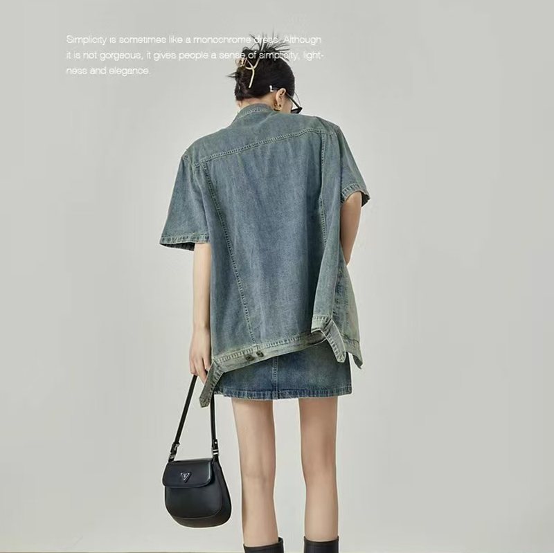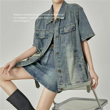 YF7150-图片色时尚夏季短袖POLO领双口袋系扣复古气质大码显瘦牛仔上衣