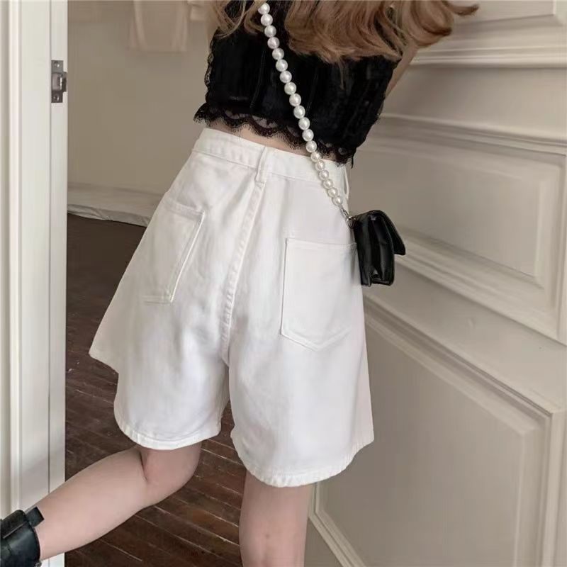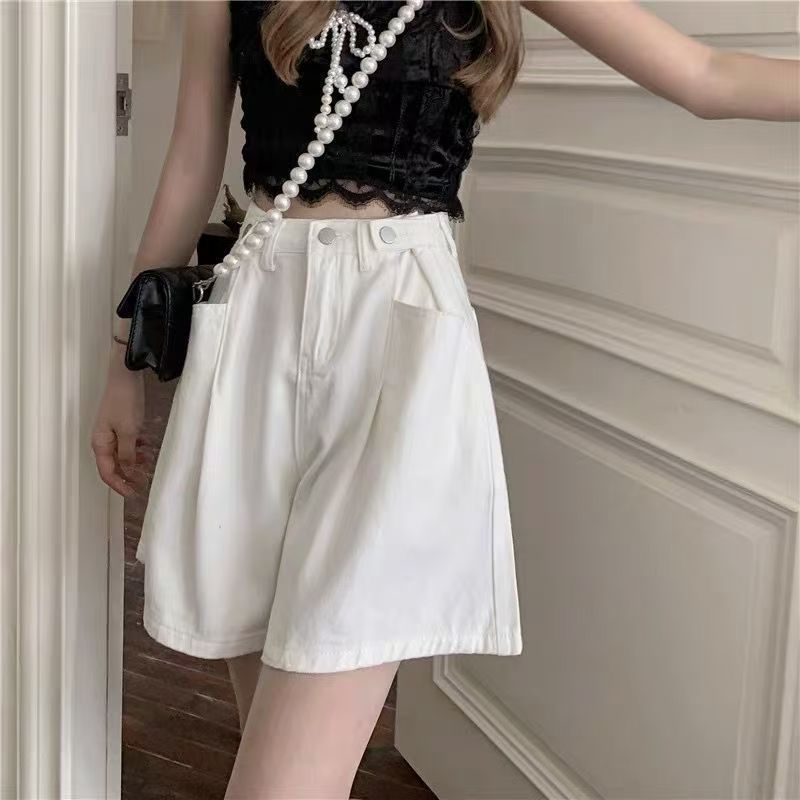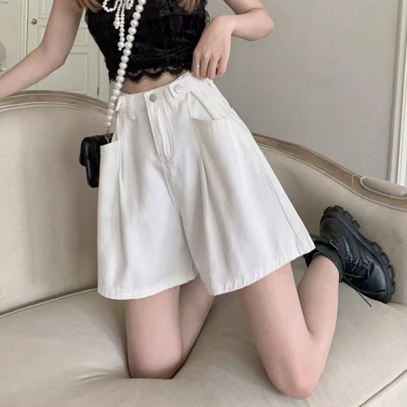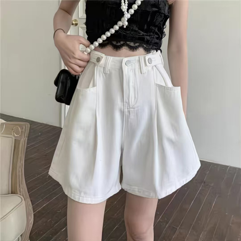 YF7167-图片色韩版白色别致可调高腰阔腿时尚五分直筒复古气质牛仔裤
