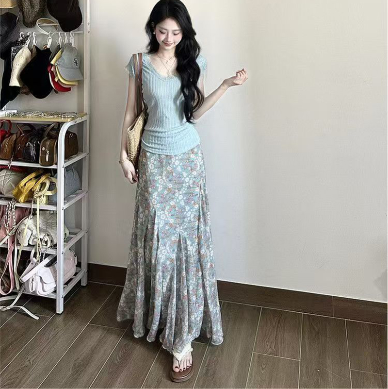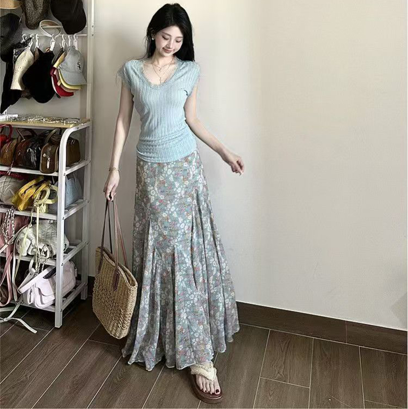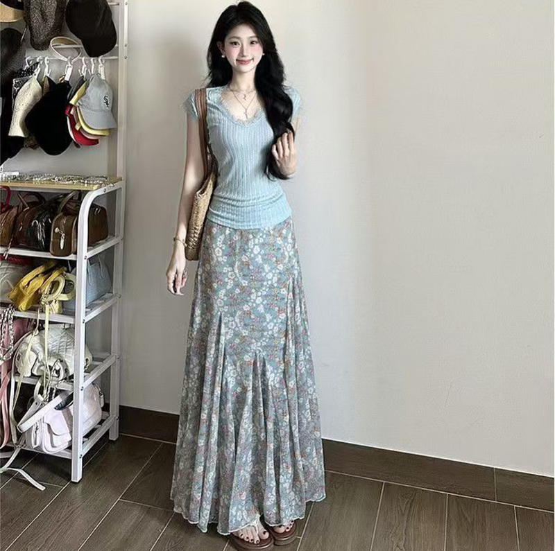 YF7484-图片色温柔风碎花收腰褶折大摆中长款坠地感蕾丝裙子