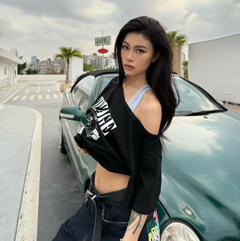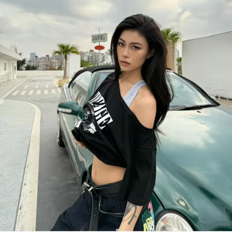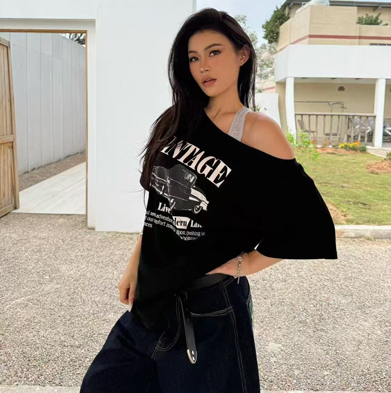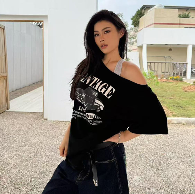 YF7493-图片色夏季慵懒风露肩汽车印花辣妹宽松大码露肩性感休闲T恤