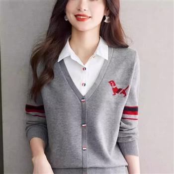 YF6249-(3色入内)小可爱狗狗刺绣假两件拼接系扣T恤款休闲针织毛衣