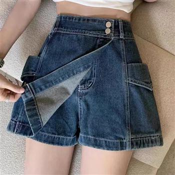 YF6000-(2色入内)韩版假两件拼接双纽扣侧口袋A字收腰包臀不规则牛仔裙裤