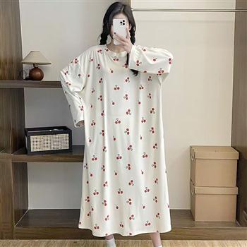 YF6038-(4色入内)新款外穿圆领长袖宽松显瘦条纹樱桃印花大码慵懒T恤裙