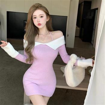 YF6063-(3色入内)时尚冬季翻领排扣露肩弹力收腰包臀设计感针织连衣裙