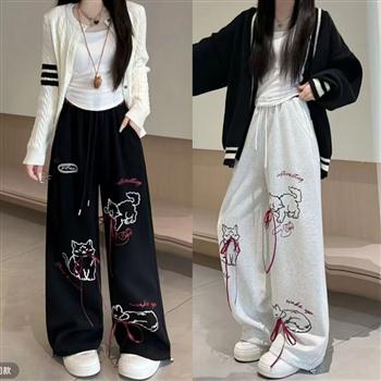 YF5633-(3色入内)小可爱狗狗印花系蝴蝶结直筒坠地感春秋涂鸦卫衣裤