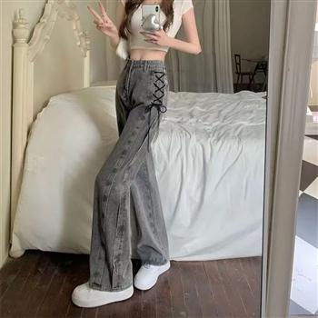 YF5658-图片色时尚个性圈圈绑绳拼接高腰直筒坠地感ins气质复古牛仔裤