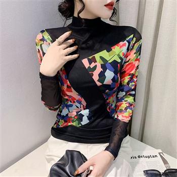 YF6338-图片色不规则数码印花设计长袖半高领弹力显瘦秋冬修身打底衫