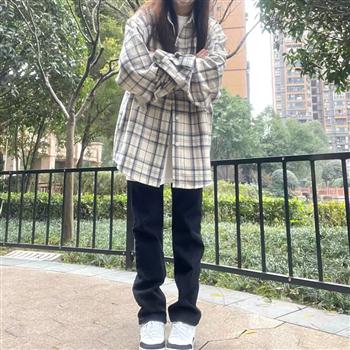 YF6381-(2色入内)时尚小外套短款长袖POLO领复古格子宽松大码百搭上衣
