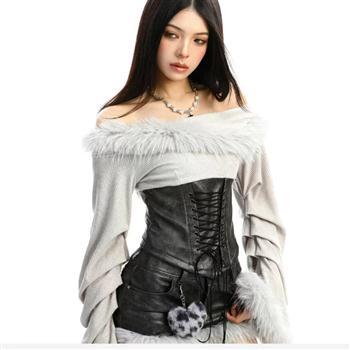 YF6991-图片色辣妹性感高腰包臀毛毛围边紧身小众设计PU皮拼接短裤