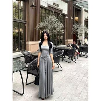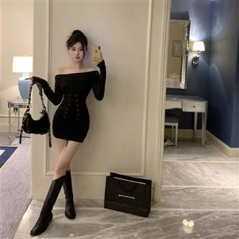 YF6992-(2色入内)纯欲风一字肩开叉绑绳假两件包臀长袖抹胸收腰紧身礼服裙
