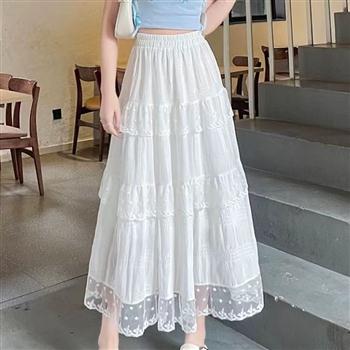 YF6994-(2色入内)春夏甜美白色蕾丝拼接A字大摆中长款设计松紧腰坠地感法式长裙