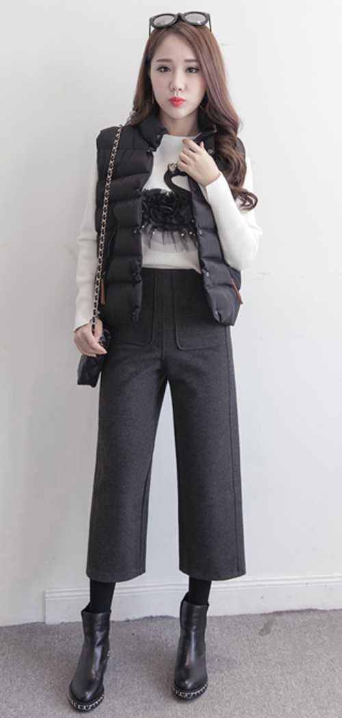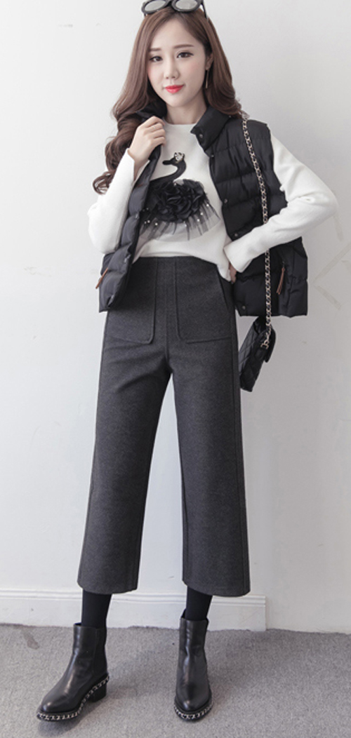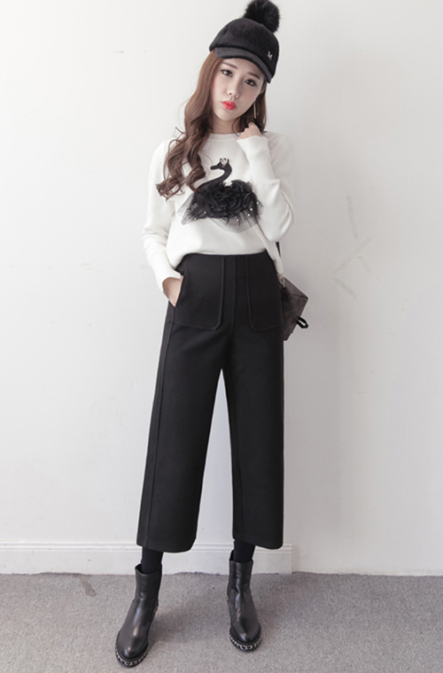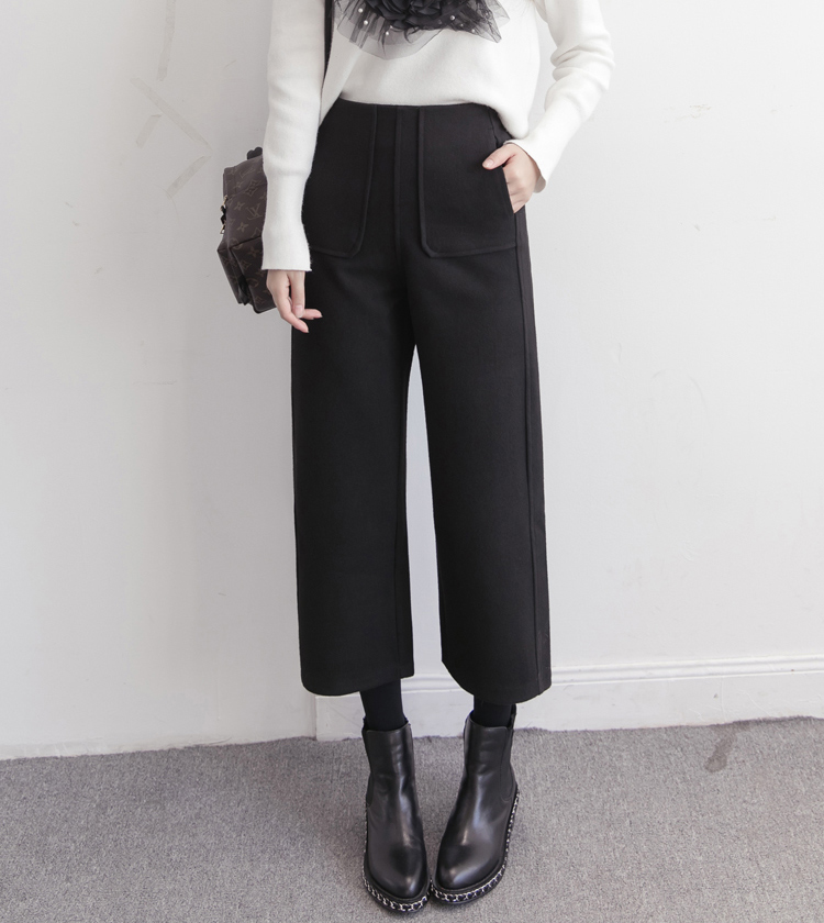 Y6596-(2色入内)韩版冬装新款松紧腰阔脚直筒宽松显瘦七分裤 加绒毛呢裤