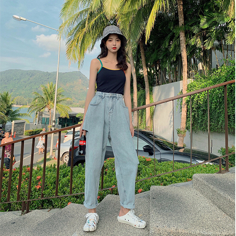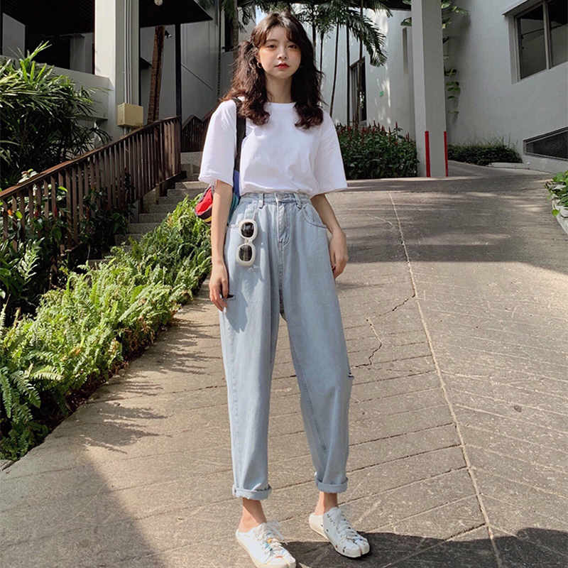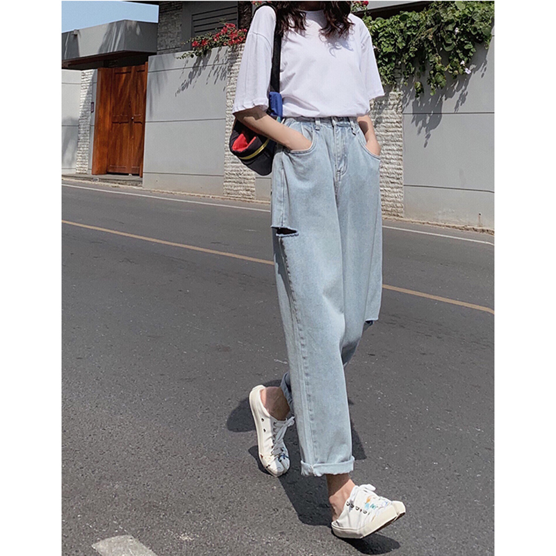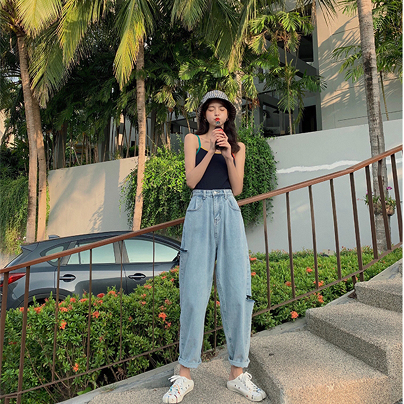 Y7575-图片色韩版时尚薄款高腰复古破洞阔脚哈伦裤 牛仔裤热裤